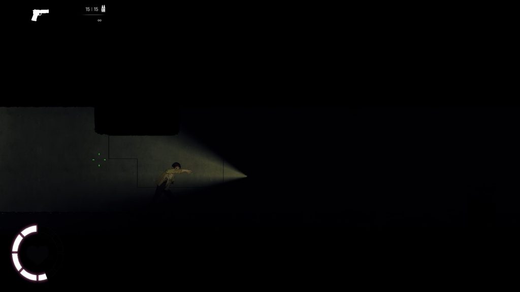 迷宮内の一部のエリアなんですが、こんな感じで全く見えないエリアがあります。ライトを持っているのでそれで照らせばいいんですが、銃の照準と同じで、マウスカーソルのほうを照らす感じになってます。